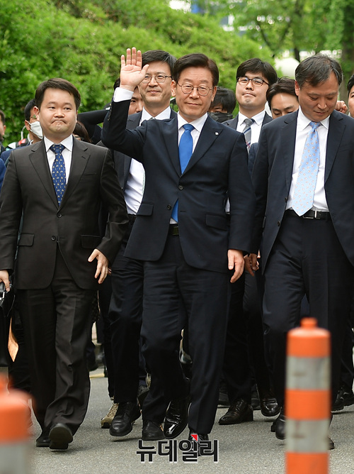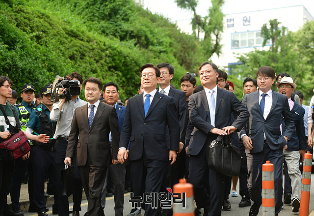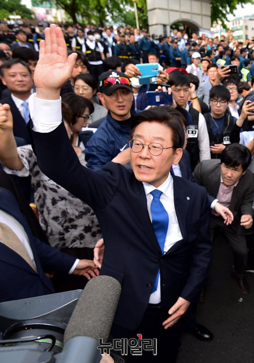 직권남용과 공직선거법 위반 혐의로 기소된 이재명 경기지사는 이날 선고공판에서 혐의 모두를 무죄선고 받았다. 이 지사는 법정에서 나와 기다리던 지지자들이 있는 법원 입구까지 걸어서 이동해 지지자들에게 손을 들어 화답하고 차량에 올랐다. (경기 성남=정상윤 기자)