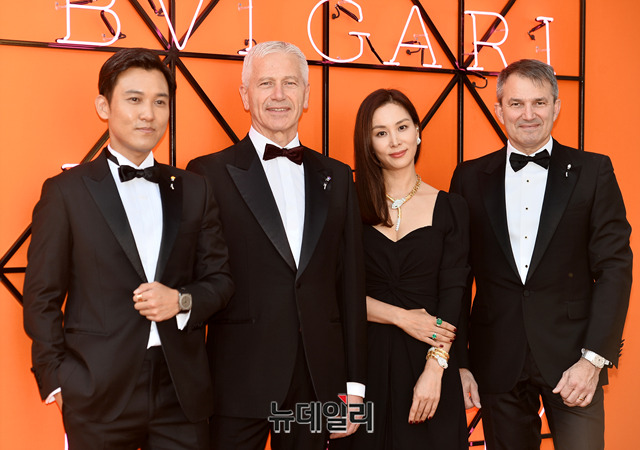이정학 불가리 코리아 매니징 디렉터(왼쪽부터), 마우로 디 로베르토 비즈니스 매니징 디렉터, 배우 고소영, 렐리오 가바짜 글로벌 세일즈 매니징 디렉터가 16일 오후 서울 중구 반얀트리 클럽 앤 스파 서울에서 열린 불가리 '와일드 팝(Wild Pop)' 주얼리 컬렉션 행사에 참석해 포토타임을 갖고 있다.