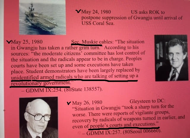 광주사태가 시작된 5월18일로부터 1주일이 지난 5월25일자 기록을 보면 당시 카터 정부의 국무장관 에드먼드 머스키(Edmond Muskie)는 “정체를 알수없는 무장 괴한들”이 온건한 시민위원회를 대신해서 주도권을 장악했다”고 전문을 보냈다.