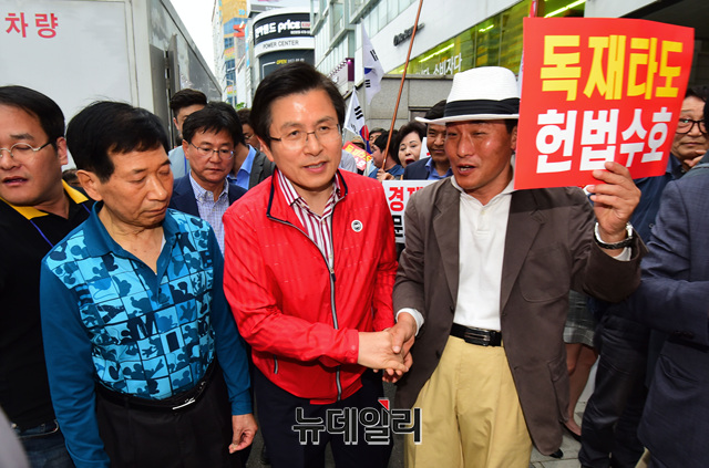 황교안 자유한국당 대표가 17일 오후 대전 서구 갤러리아백화점 앞에서 열린 '문재인 STOP, 국민이 심판합니다' 규탄대회에 입장하며 참석자들과 인사를 나누고 있다. 황 대표와 한국당 지도부는 서울과 대구, 광주 등 전국을 순회하며 규탄대회를 진행하고 있다. (대전=이종현 기자)