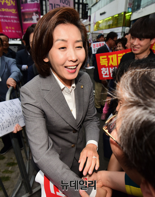 나경원 자유한국당 원내대표가 17일 오후 대전 서구 갤러리아백화점 앞에서 열린 '문재인 STOP, 국민이 심판합니다' 규탄대회에 입장하며 참석자들과 인사를 나누고 있다. (대전=이종현 기자)