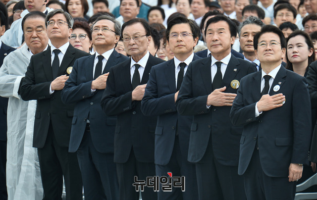 이해찬 더불어민주당 대표(왼쪽부터), 황교안 자유한국당 대표, 손학규 바른미래당 대표가 18일 오전 광주 북구 국립5.18민주묘지에서 열린 제39주년 5.18광주민주화운동 기념식에서 국민의례를 하고 있다. (광주=박성원 기자)