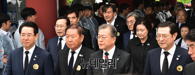 문재인 대통령과 부인 김정숙 여사, 노영민 비서실장, 조국 민정수석이 18일 오전 광주 북구 국립5·18민주묘지에서 열린 제39주년 5·18민주화운동 기념식에 참석하기 위해 입장하고 있다. (광주=이종현 기자)