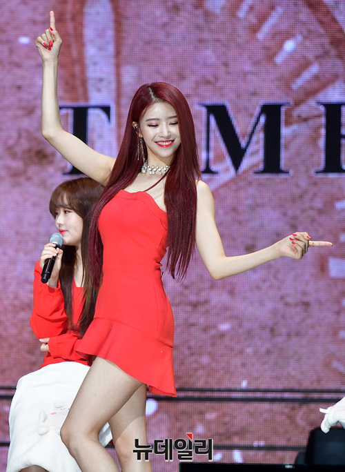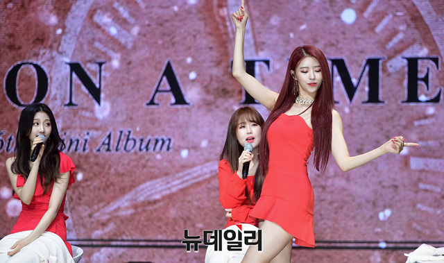 걸그룹 러블리즈 미주가 20일 오후 서울 용산구 블루스퀘어에서 열린 6번째 미니앨범 'Once Upon A Time(원스 어펀 어 타임)' 쇼케이스에서 타이틀곡 포인트 안무를 선보이고 있다.
