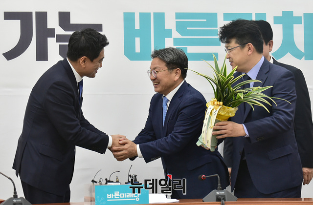 [포토] 강기정 정무수성 맞이 하는 오신환 원내대표