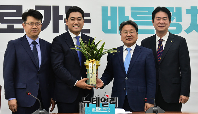 오신환 바른미래당 원내대표가 20일 오후 국회 원내대표실에서 강기정 청와대 정무수석을 예방을 받고 인사를 나누고 있다.