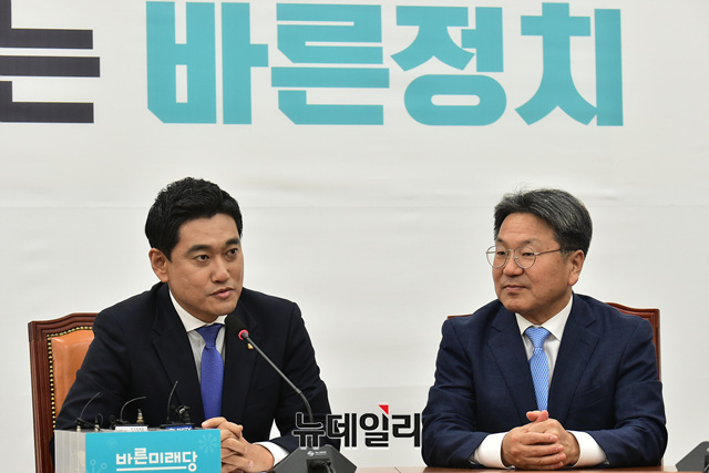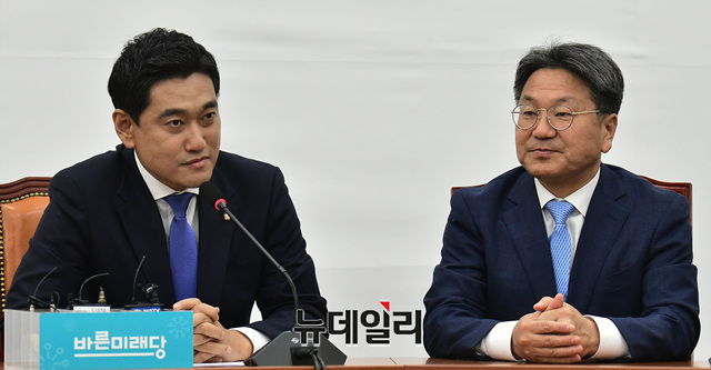 오신환 바른미래당 원내대표가 20일 오후 국회 원내대표실에서 강기정 청와대 정무수석을 예방을 받고 환담을 나누고 있다.
