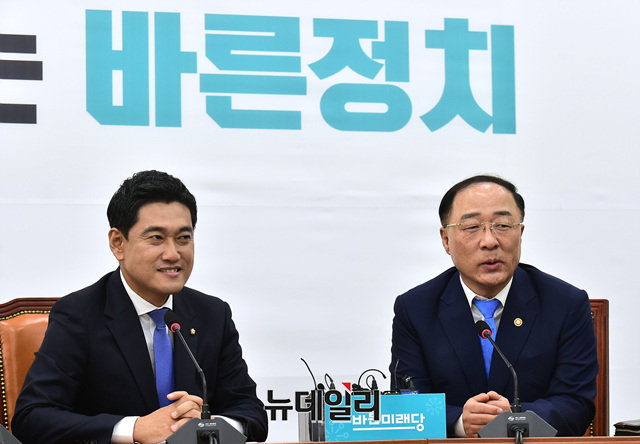 오신환 바른미래당 원내대표가 20일 오후 국회 원내대표실에서 홍남기 경제부총리 겸 기획재정부 장관의 예방을 받고 환담을 나누고 있다.