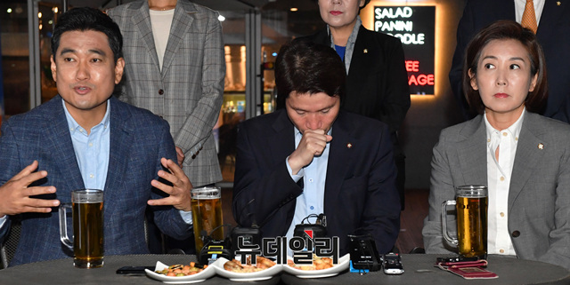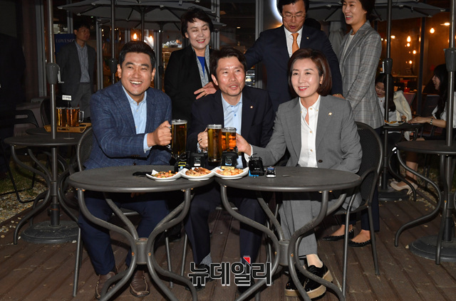 여야 3당 교섭단체 원내대표가 20일 오후 서울 여의도 국회 인근 호프집에서 '맥주 회동'을 갖고 있다. 이날 회동은 패스트트랙 사태 이후 파행 되고 있는 국회정상화를 위해 오신환 의원이 제안했다. (왼쪽부터 오신환 바른미래당, 이인영 더불어민주당, 나경원 자유한국당 원내대표, 사진=국회사진기자단)