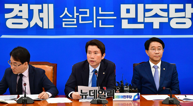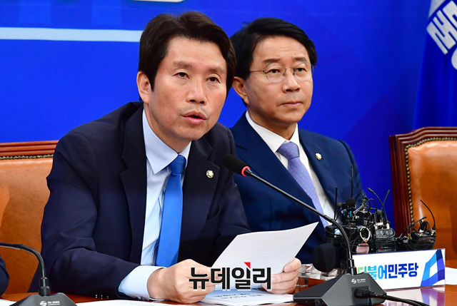 이인영 더불어민주당 원내대표가 21일 오전 국회에서 열린 원내대책회의에서 모두발언을 하고 있다.