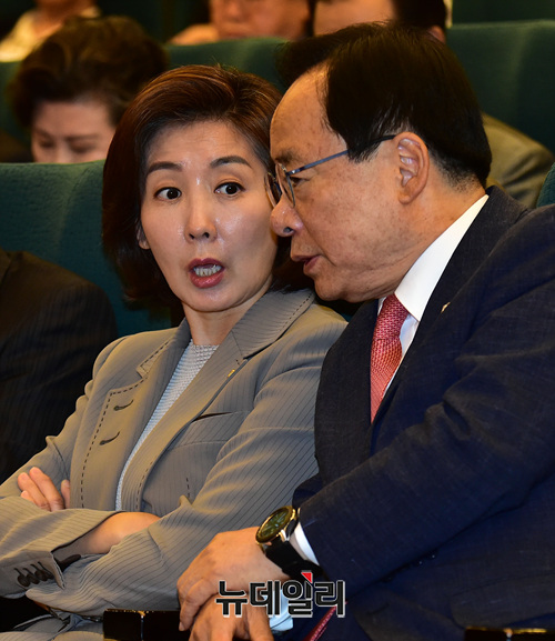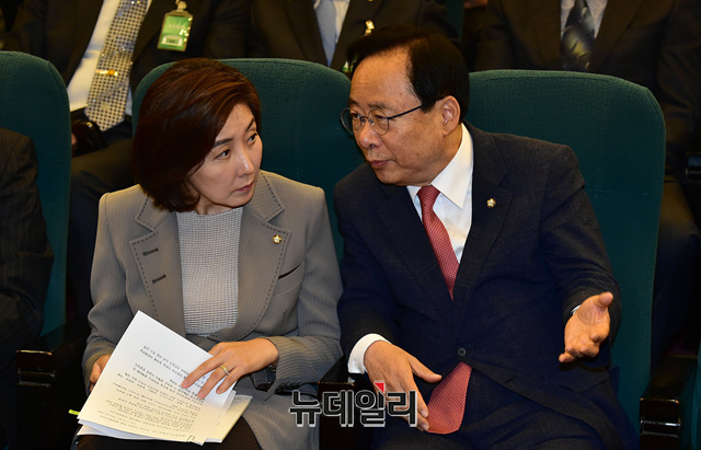 나경원 자유한국당 원내대표와 이주영 국회 부의장이 21일 국회도서관 대강당에서 열린 '문 정권 2년, 유린 된 사법과 언론:사법부 대위기 토론회'에서 대화를 나누고 있다.