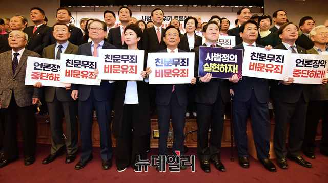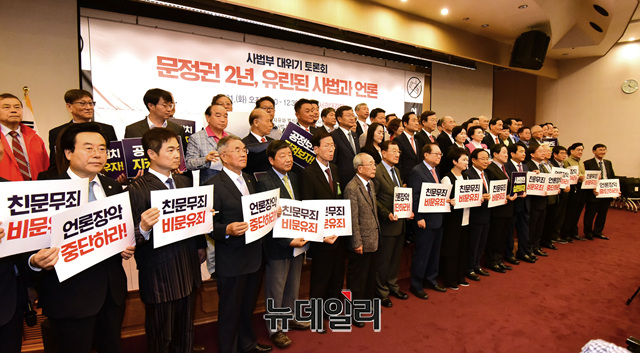'문 정권 2년, 유린 된 사법과 언론 : 사법부 대위기 토론회'가 21일 오전 국회도서관 대강당에서 열린 가운데 참석자들이 기념 사진을 촬영하고 있다. 이날 행사는 이주영 국회부의장, 자유와 법치를 위한 변호사연합의 공동 주최로 열렸다.
