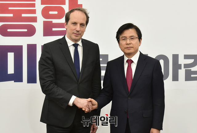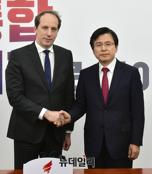 황교안 자유한국당 대표가 21일 오후 국회를 찾은 파비앙 페논 주한 프랑스대사를 만나 악수하고 있다.
