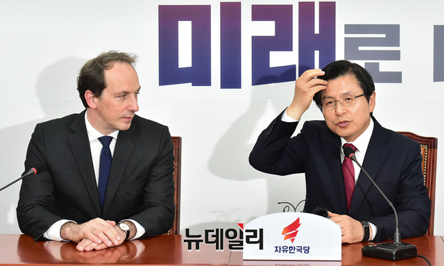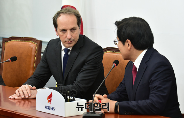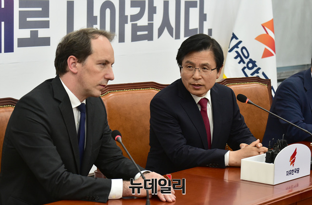 [포토] 대화 나누는 황교안 한국당 대표와 파비앙 페논 주한 프랑스대사