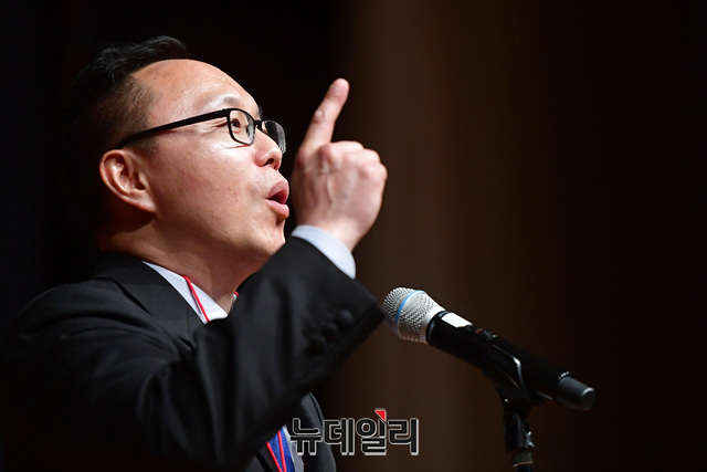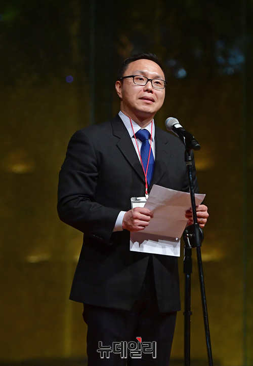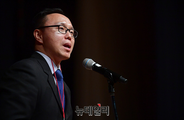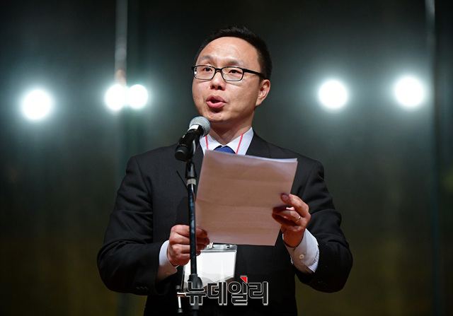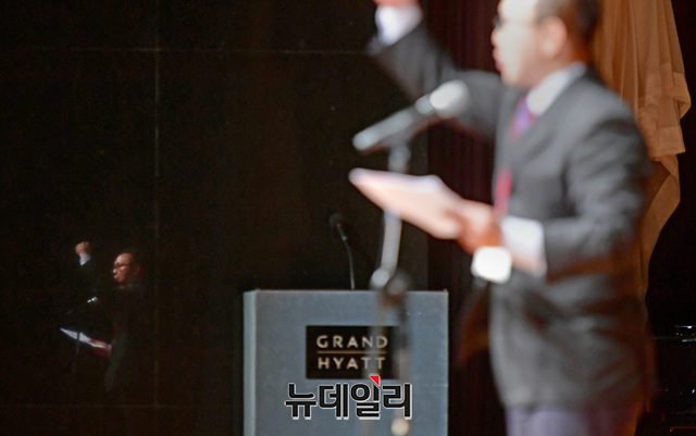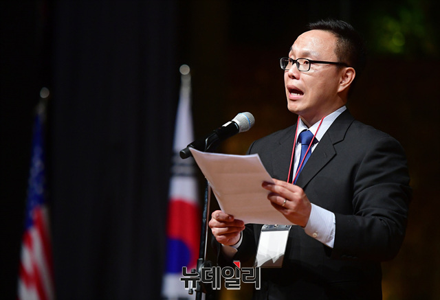 김은구 서울대 트루스포럼 대표가 21일 오후 서울 용산구 그랜드하얏트서울 호텔에서 열린 '한·미자유우호의밤(US·ROK Freedom Friendship Night)' 행사에서 결의문을 발표하고 있다.이날 행사에서 각 주제별로 진행된 강연은 △경제정책(이병태) △외교정책(김영호) △안보정책(신원식) △미디어언론(김진) △국회의몰락(이언주) △헌법의붕괴(이정훈) △시민운동창출(조평세) △미국보수주의연합(댄 슈나이더) △한국의 자유와 민주주의의 상실(고든 창) 등이 나섰다.'한·미자유우호의밤'은 한국과 미국의 리더들이 한미동맹의 가치와 북한해방, 시민사회단체의 우호증진을 위해 한국자유회의와 NEW INSTITUTE 등 50여개 시민사회단체가 공동으로 주최한 행사다.