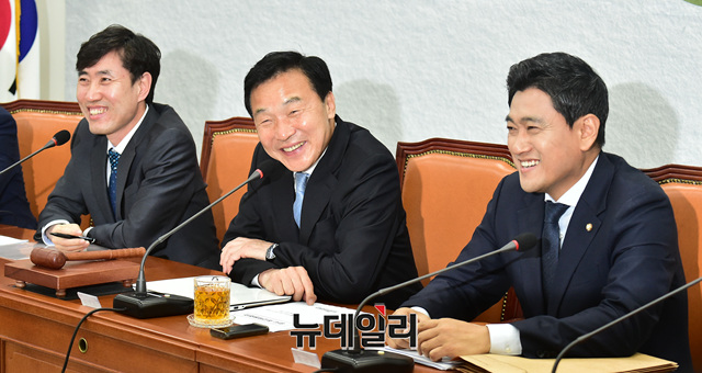 손학규 바른미래당 대표, 오신환 원내대표, 하태경 최고위원이 22일 오전 국회에서 열린 임시 최고위원회의에서 환하게 웃고 있다.