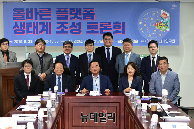 정갑윤 자유한국당 의원, 권혁조 파이터치연구원 이사장, 소상공인연합회 최승재 회장 등 토론회 참석자들이 22일 오후 국회 의원회관에서 파이터치연구원 주관으로열린 '올바른 플랫폼 생태계 조성' 토론회에 앞서 기념촬영을 하고 있다.