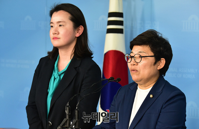 국회 환경노동위원회 소속 임이자·신보라 자유한국당 의원이 22일 오후 국회 정론관에서 기자회견을 갖고 '정부의 ILO협약비준 추진'에 대한 한국당의 입장을 발표하고 있다.