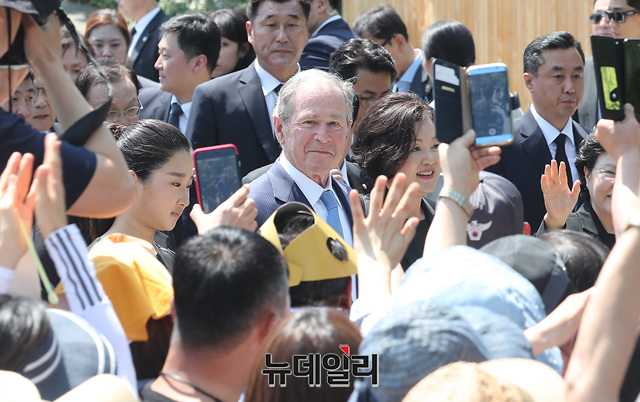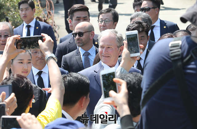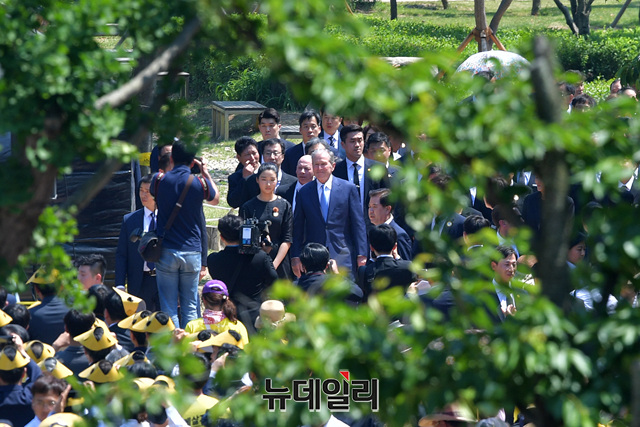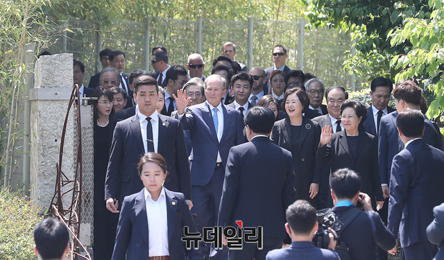 조지 W. 부시 전 미국 대통령, 권양숙 여사, 김정숙 여사가 23일 경남 김해 봉하마을에서 열린 故 노무현 대통령 10주기 추모식에 입장하고 있다. (경남 김해=정상윤 기자)
