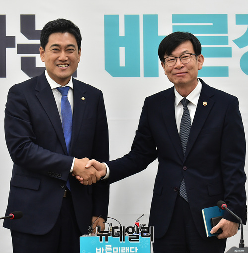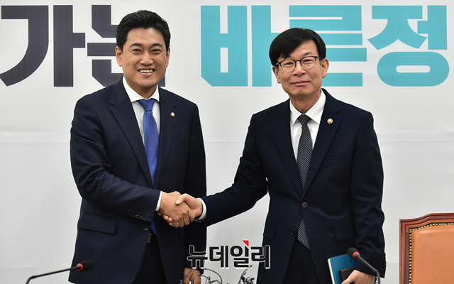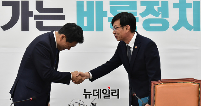오신환 바른미래당 원내대표가 23일 오후 국회에서 김상조 공정거래위원장의 예방을 받고 인사를 나누고 있다.