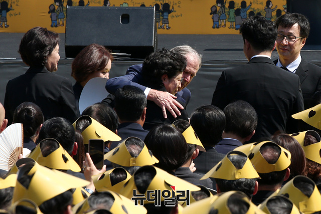 조지 부시 전 미국 대통령이 23일 오후 경남 김해 봉하마을에서 엄수된 '故 노무현 대통령 10주기 추도식'에서 추도사를 마친 뒤 권양숙 여사를 포옹하며 위로하고 있다. (경남 김해=정상윤 기자)
