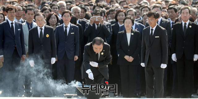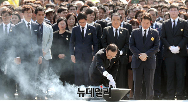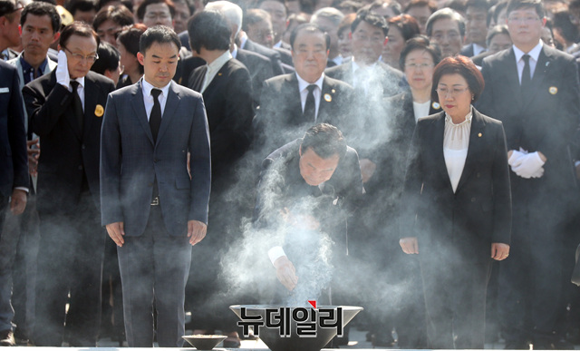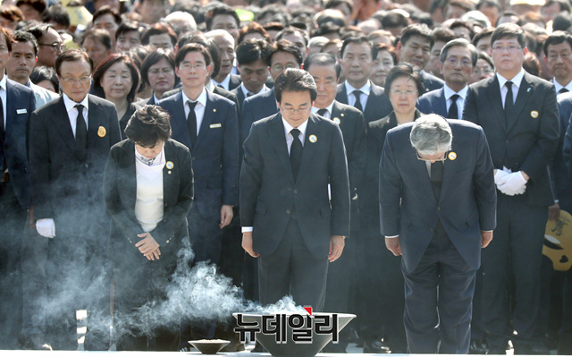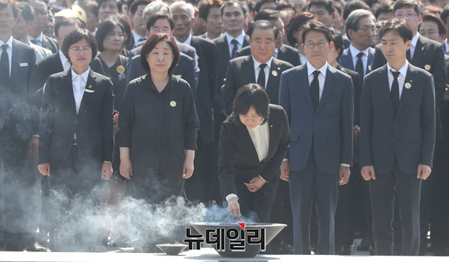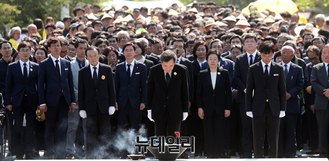 자유한국당 조경태 의원 등이 23일 오후 경남 김해시 진영읍 봉하마을에서 열린 노무현 전 대통령 서거 10주기 추도식에서 분향하고 있다. 문희상 국회의장, 이낙연 국무총리, 이해찬 더불어민주당 대표, 손학규 바른미래당 대표, 정동영 민주평화당 대표 등 정치권에서 참배를 했다. (경남 김해=정상윤 기자)