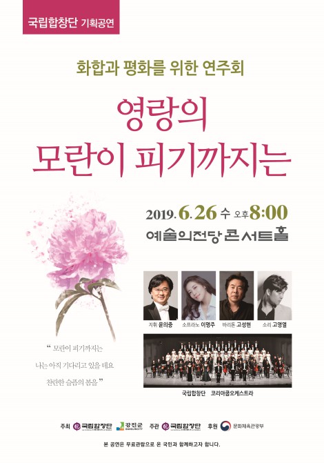국립합창단이 '동방의 빛'을 이을 두 번째 기획공연을 선보인다.2019년 3편의 기획공연을 준비한 국립합창단은 강진군과 함께 6월 26일 오후 8시 예술의전당 콘서트홀에서 '영랑의 모란이 피기까지는'을 공연한다.이번 국내 최정상급 성악가 바리톤 고성현, 소프라노 이명주, 국악계의 아이돌 젊은 소리꾼 고영열이 참여하며, 코리아쿱오케스트라와 황수경 아나운서의 해설이 함께한다.기존에 발표된 김소월 시에 멜로디를 얹은 '못잊어', '산', '초혼'과 작곡가 우효원·오병희가 김영랑 시로 새롭게 창작되는 6곡 '내 마음을 아실 이', '북', '모란이 피기까지는', '오메 단풍 들겄네', '끝없는 강물이 흐르네', '바다로 가자'를 초연한다.앞서 지난 3월 3·1운동 및 대한민국 임시정부 수립 100주년을 기념하여 제작한 창작칸타타 '동방의 빛'을 발표해 큰 호응을 얻었다. 8월에는 '8·15 광복절기념 합창대축제'로 15~16일 창작칸타타로 이틀간 예술의전당 콘서트홀에서 열린다.'영랑의 모란이 피기까지는'는 전석 초대(무료공연)다. 공연예약은 국립합창단 홈페이지에서 가능하며, 예약기간은 6월 16일까지다.