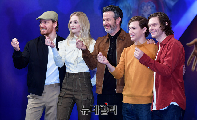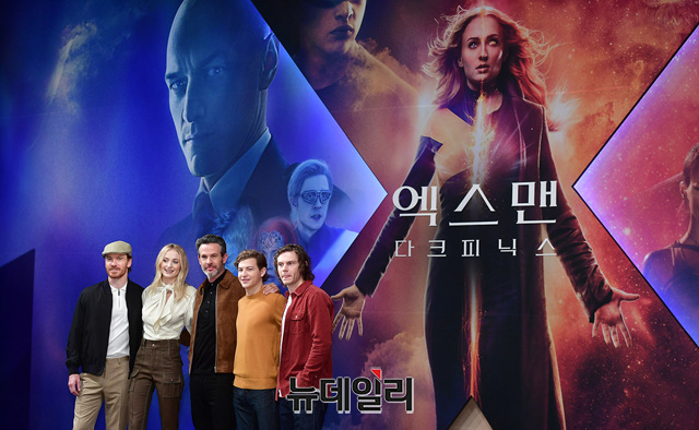 배우 마이클 패스벤더(왼쪽부터), 소피 터너, 사이먼 킨버그 감독, 타이 쉐리던, 에반 피터스 27일 오전 서울 여의도 콘래드호텔에서 열린 영화 '엑스맨: 다크 피닉스' 내한 기자간담회에서 포토타임을 갖고 있다.