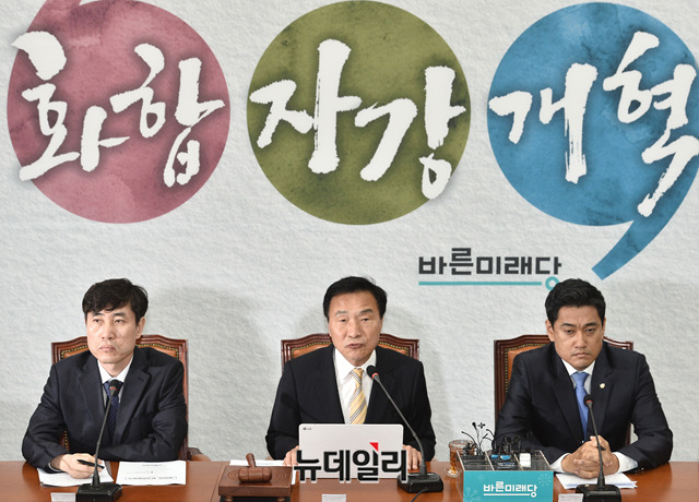 손학규 바른미래당 대표가 27일 오전 국회에서 열린 최고위원회의에서 모두발언을 하고 있다. 이날 손 대표는 "퇴진은 없다"며 "대표의 퇴진을 전제로 한 당 혁신위원회 구성안은 애초에 없다"고 말했다.