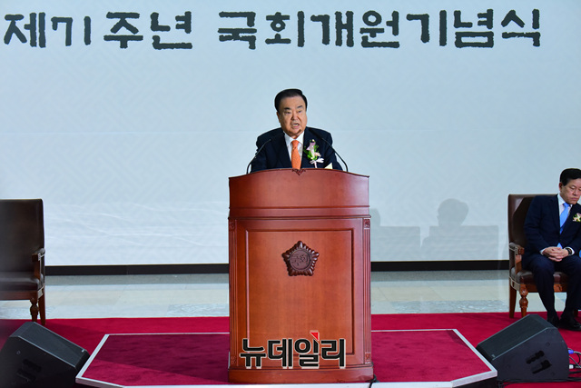 문희상 국회의장이 27일 오전 국회 본청 중앙홀에서 열린 제71주년 국회 개원 기념식에서 기념사를 하고 있다.