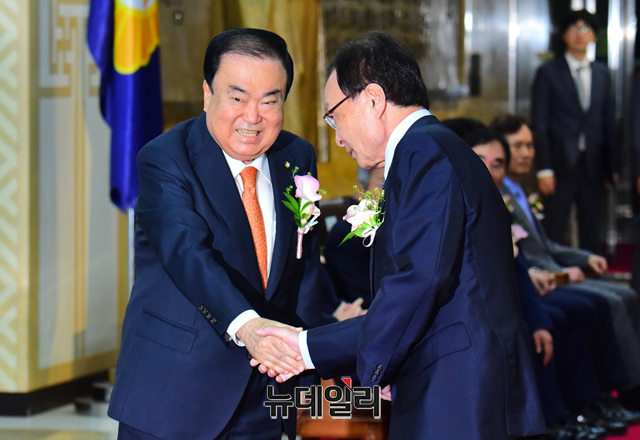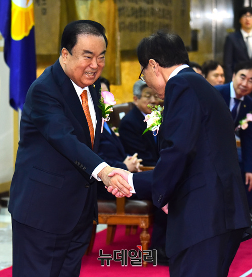 문희상 국회의장이 27일 오전 국회 본청 중앙홀에서 열린 제71주년 국회 개원 기념식에 참석해 이해찬 더불어민주당 대표와 악수를 나누고 있다.
