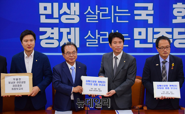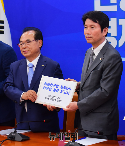 오거돈 부산시장이 27일 오후 국회에서 더불어민주당 원내대표실에서 열린 '부산·울산·경남 동남권 관문공항 검증결과 대국민보고대회 사전 간담회 및 보고서 전달식'에서 이인영 원내대표에게 보고서를 전달하고 있다.