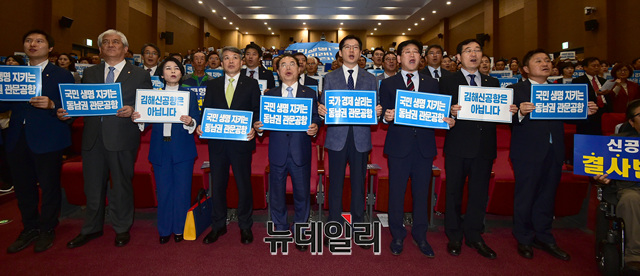 오거돈 부산시장, 김경수 경남도지사, 김석진 울산시 행정부시장 등 참석자들이 27일 오후 국회 의원회관에서 열린 '부·울·경 동남권 관문공항 검증결과 대국민 보고회'에서 구호를 외치고 있다.