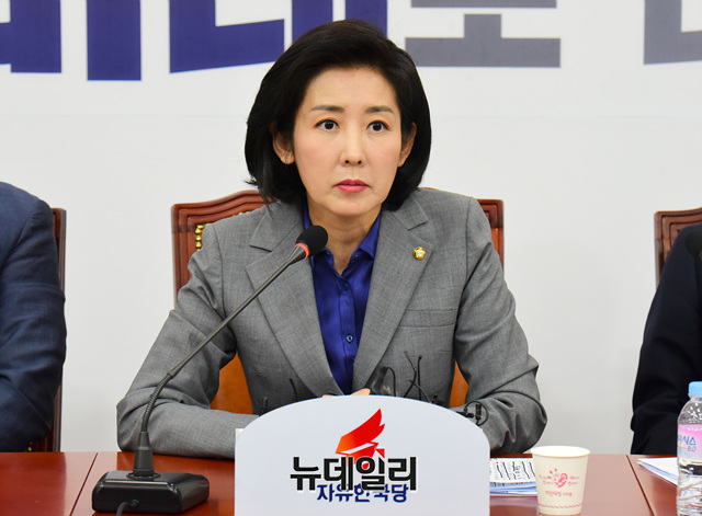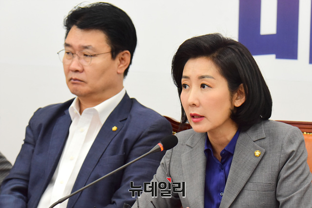 나경원 자유한국당 원내대표가 28일 오전 국회에서 열린 원내대책회의에 참석해 모두발언을 하고 있다.