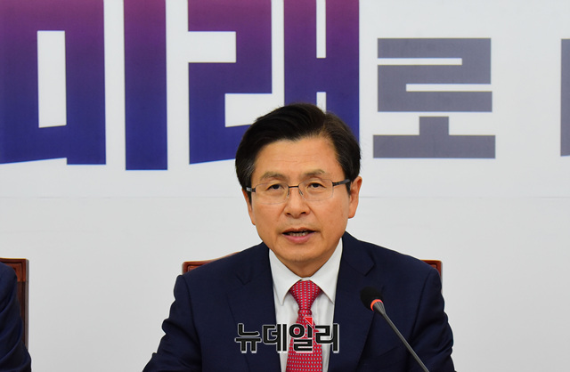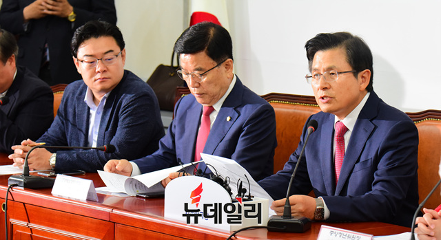 황교안 자유한국당 대표가 28일 오전 국회에서 열린 주요당직자 회의에서 모두발언을 하고 있다.