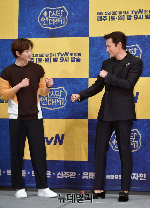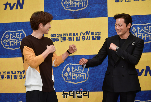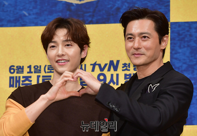 배우 장동건, 송중기가 28일 오후 서울 강남구 임피리얼팰리스 호텔에서 열린 tvN 토일드라마 '아스달 연대기(연출 김원석, 극복 김영현 박상연)' 제작발표회에서 포토타임을 갖고 있다.