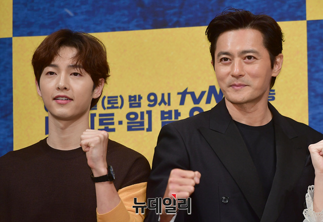 배우 송중기(왼쪽부터), 장동건, 김지원, 김옥빈이 28일 오후 서울 강남구 임피리얼팰리스 호텔에서 열린 tvN 토일드라마 '아스달 연대기(연출 김원석, 극복 김영현 박상연)' 제작발표회에서 포토타임을 갖고 있다.