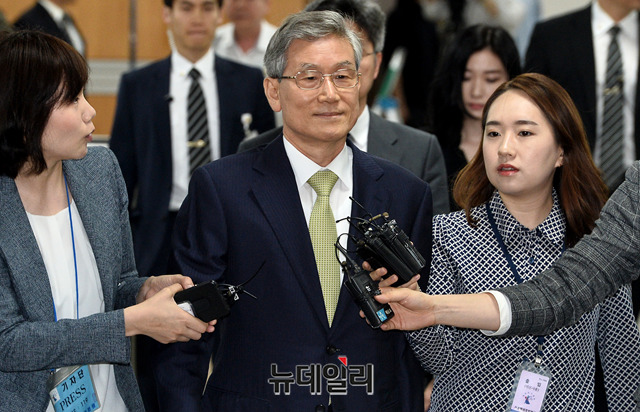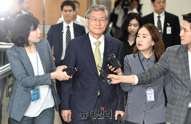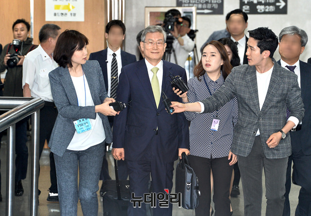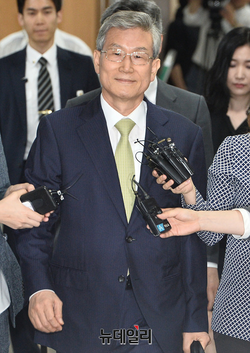 사법행정권 남용 혐의로 기소된 고영한 전 대법관이 29일 오전 서울 서초구 서울중앙지법에서 열린 첫 공판에 출석하고 있다.