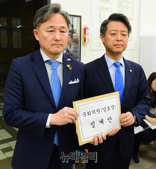 표창원·김영호 더불어민주당 의원이 29일 오후 국회 의안과를 찾아 강효상 자유한국당 의원의 징계안을 제출하고 있다.