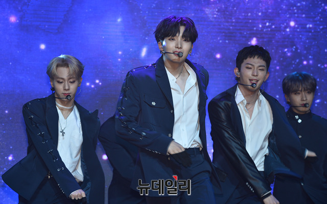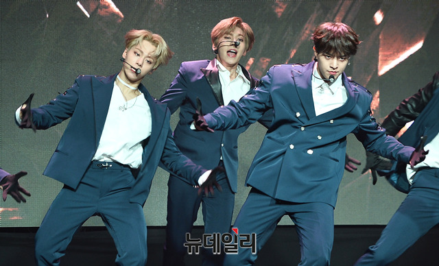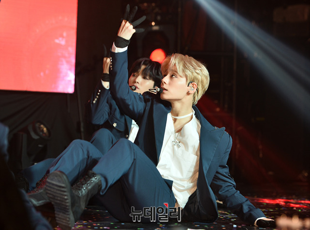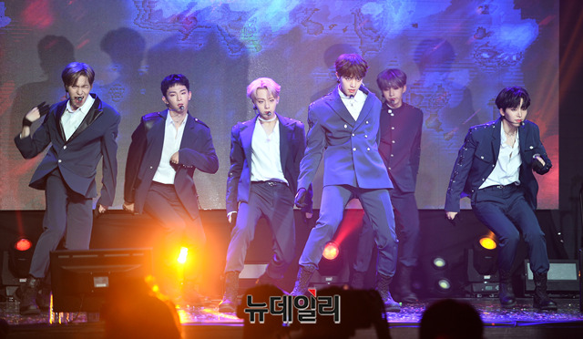 아이돌그룹 '원어스(ONEUS)'가 29일 오후 서울 마포구 무브홀에서 열린 2번째 앨범 'RAISE US(라이즈 어스)' 쇼케이스에서 수록곡을 선보이고 있다.