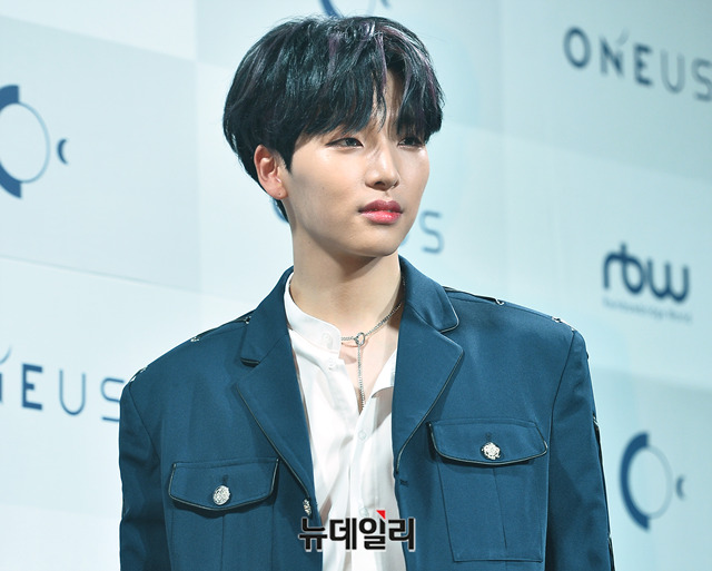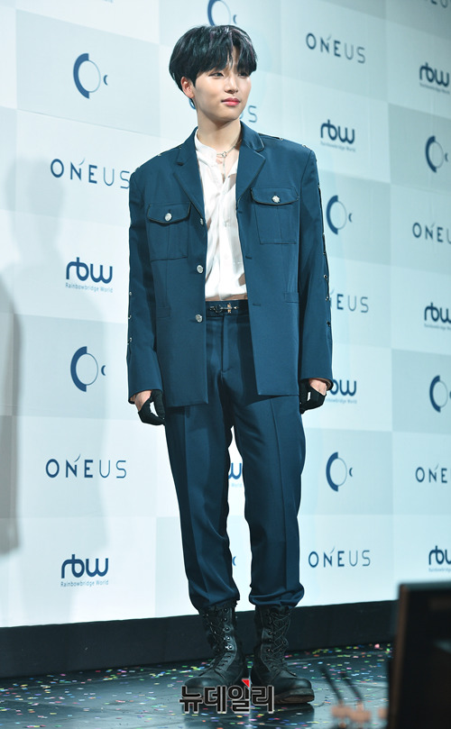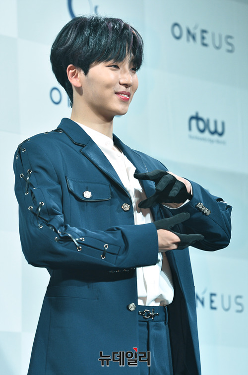 아이돌그룹 '원어스(ONEUS)' 서호가 29일 오후 서울 마포구 무브홀에서 열린 2번째 앨범 'RAISE US(라이즈 어스)' 쇼케이스에서 포토타임을 갖고 있다.