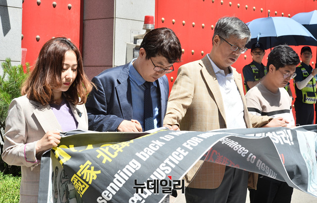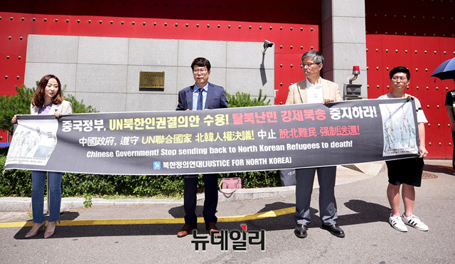 북한정의연대(Justice For North Korea, JFNK)가 29일 오후 서울 중구 주한중국대사관 앞에서 탈북난민북송중지를 위한 캠페인을 열고, 탈북난민들을 위해 기도를 하고 있다.북한정의연대는북한 인권과 탈북난민 실태를 알리는 캠페인으로 25일부터 6월 1일까지 '북한정의주간'을 진행한다. 1일 오후에는 신촌에 위치한 카페 히브루스에서 'Crossing three borders(세 개의 국경을 넘다, 2013)' 다큐멘터리 상영 등을 진행할 예정이다.