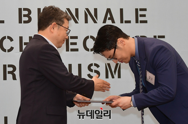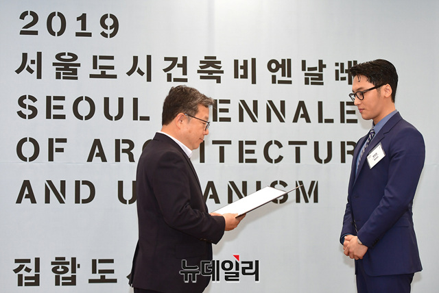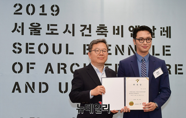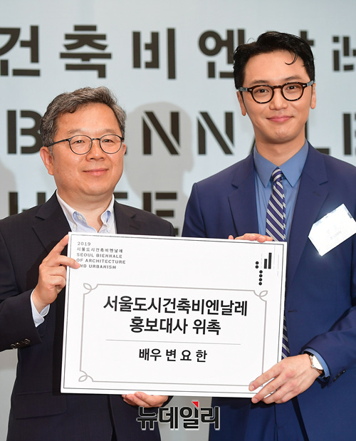 배우 변요한이 30일 오전 서울 중구 서울도시건축전시관에서 열린 '2019서울도시건축비엔날레(이하 서울비엔날레)' 성공 개최를 위한 기념행사에서 진희선 서울시 행정2부시장에게 홍보대사 위촉장을 받고 기념촬영을 하고 있다.서울비엔날레 개막 100일을 앞두고 진행된 이날 행사는 개막날짜를 알리는 표시기 제막식과 큐레이터, 시민홍보단, 홍보대사 위촉식이 진행됐다.서울비엔날레는 도시·건축을 매개로 하는 국제행사로 올해로 2회를 맞는다. '집합도시'를 주제로 9월 7일부터 11월 10일까지 총 65일간 동대문디자인플라자, 돈의문박물관마을, 서울도시건축전시관 등 서울 도심 곳곳에서 진행될 예정이다.