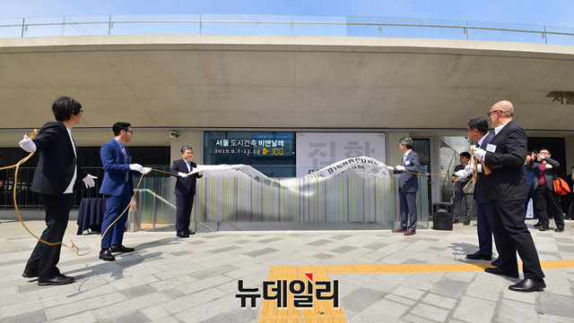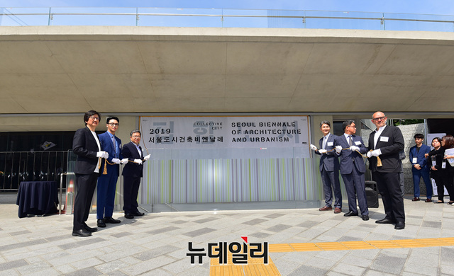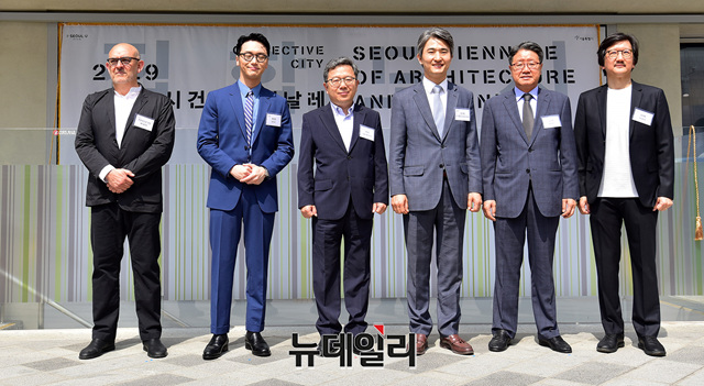 '2019서울도시건축비엔날레(이하 서울비엔날레)' 성공 개최를 위한 기념행사 주요 참석자들이 30일 오전 서울 중구 서울도시건축전시관에서 열린 기념행사에서 개막날짜를 알리는 표시기 제막식에 앞서 기념 촬영을 하고 있다.서울비엔날레 개막 100일을 앞두고 진행된 이날 행사는 개막날짜를 알리는 표시기 제막식과 큐레이터, 시민홍보단, 홍보대사 위촉식이 진행됐다.서울비엔날레는 도시·건축을 매개로 하는 국제행사로 올해로 2회를 맞는다. '집합도시'를 주제로 9월 7일부터 11월 10일까지 총 65일간 동대문디자인플라자, 돈의문박물관마을, 서울도시건축전시관 등 서울 도심 곳곳에서 진행될 예정이다.(사진은 왼쪽부터 임재용 총감독, 변요한 홍보대사, 진희성 부시장, 김인제 도시관리위원장, 임근형 국제관계대사, 프란시스코 사닌 총감독.)