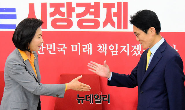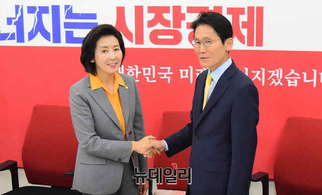 윤소하 정의당 원내대표가 30일 오전 국회에서 나경원 자유한국당 원내대표를 예방해 악수를 나누고 있다.