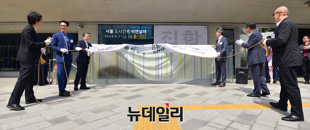 진희선 서울시 행정2부시장(왼쪽부터), 홍보대사 변요한, 임재용 총감독이 30일 오전 서울 중구 서울도시건축전시관에서 열린 '2019서울도시건축비엔날레(이하 서울비엔날레)' 성공 개최를 위한 기념행사에서 대화를 나누고 있다.서울비엔날레 개막 100일을 앞두고 진행된 이날 행사는 개막날짜를 알리는 표시기 제막식과 큐레이터, 시민홍보단, 홍보대사 위촉식이 진행됐다.서울비엔날레는 도시·건축을 매개로 하는 국제행사로 올해로 2회를 맞는다. '집합도시'를 주제로 9월 7일부터 11월 10일까지 총 65일간 동대문디자인플라자, 돈의문박물관마을, 서울도시건축전시관 등 서울 도심 곳곳에서 진행될 예정이다.