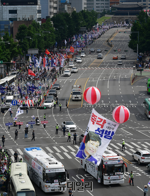 대한애국당이 1일 오후 서울 중구 서울역광장에서 제126차 태극기집회를 열고 '박근혜 전 대통령의 즉각 석방' 요구하며 광화문광장으로 가두행진을 하고 있다.
