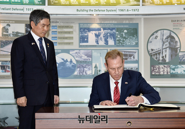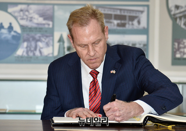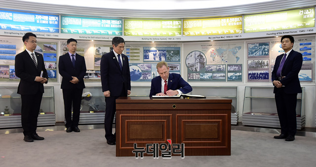 '패트릭 새너핸' 미국 국방부 장관 대행이 3일 오전 서울 용산구 국방부에서 열린 한미 국방장관 회담에 앞서 방명록을 작성하고 있다.