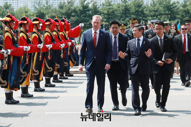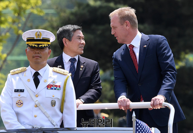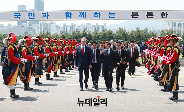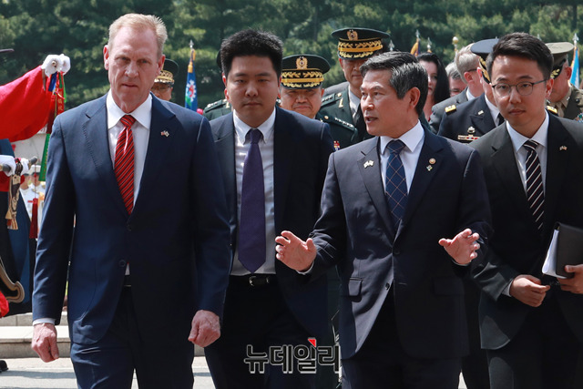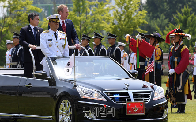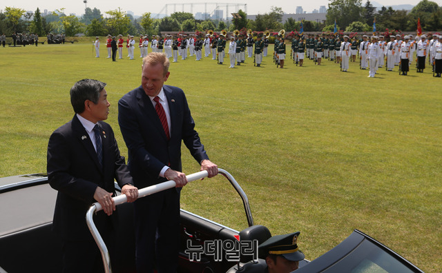 정경두 국방부 장관(왼쪽)과 패트릭 새너핸 미국 국방부장관 대행이 3일 서울 용산 국방부에서 국군의장대 사열을 받으며 대화하고 있다.
