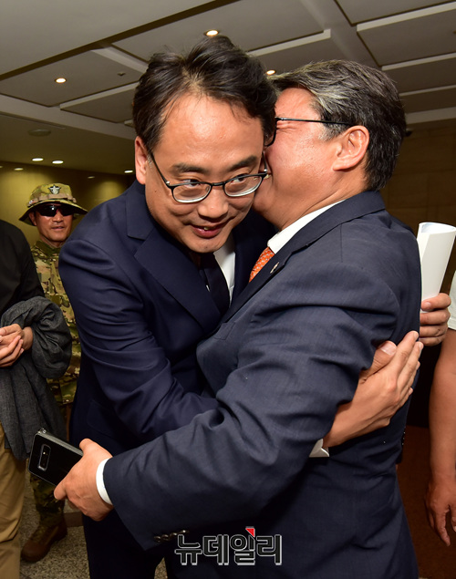 조원진 대한애국당 대표와 변희재 미디어워치 대표고문이 4일 오전 서울 중구 한국프레스센터에서 열린 'JTBC태블릿PC조작 특검추진 기자회견' 직후 회견장을 나서며 포옹을 하고 있다.이날 특검추진 기자회견에는 조원진 대한애국당 대표와 김진태 자유한국당 의원이 참석해 격려사를 했다. 도태우 법치와자유민주주의연대 대표가 '검찰과 JTBC의 증거조작 기록'을 주제로 발제를 맡았다. 변희재 대표고문은 구속부터 석방까지 소회를 밝혔다. 또 많은 유튜버가 참석해 기자회견을 생중계 했다.